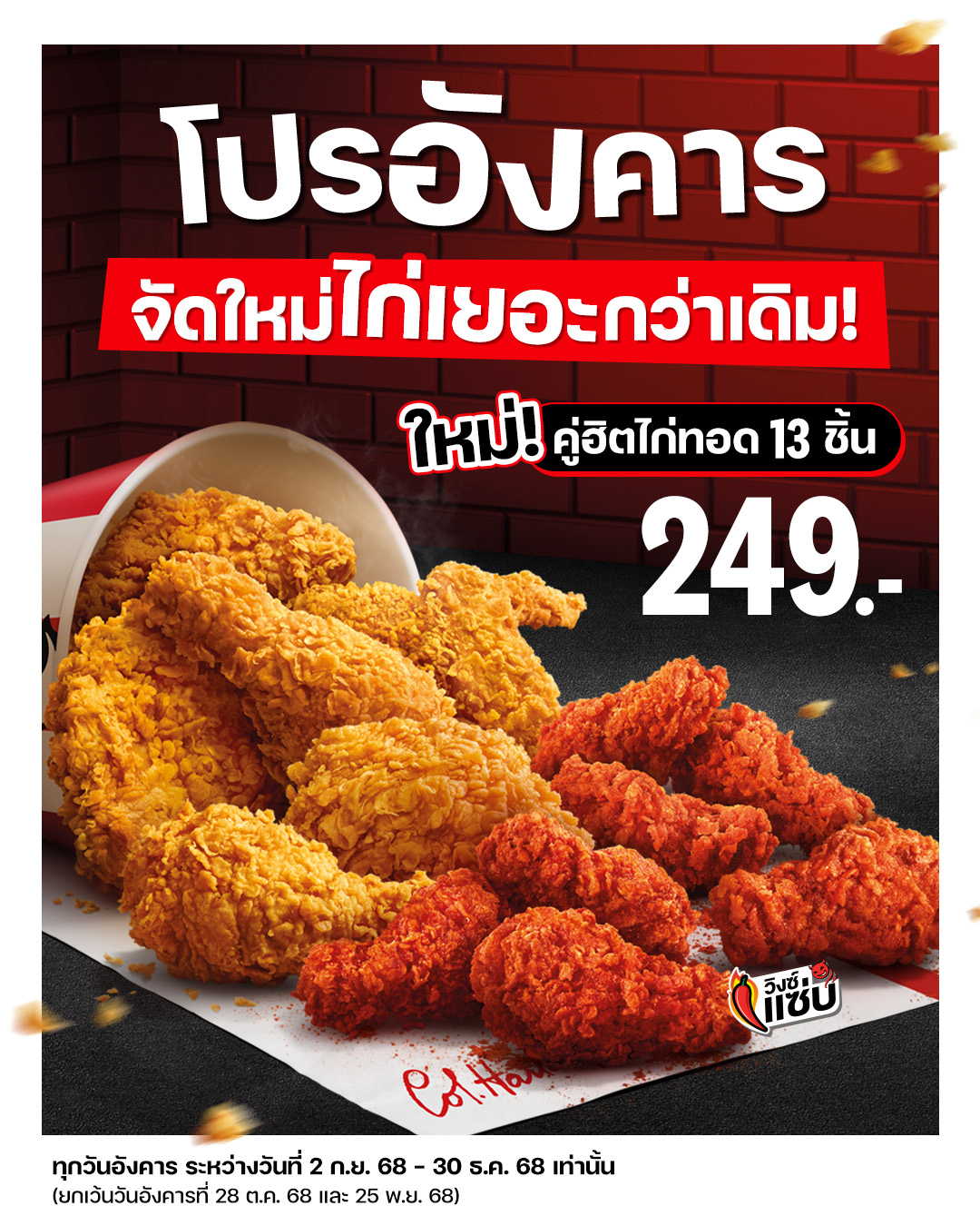 ใครคิดถึงไก่ทอด KFC ต้องรีบเลย 🍗 ได้ทั้ง ไก่ทอด 6 ชิ้น + วิงซ์แซ่บ 7 ชิ้น รวมแล้ว 13 ชิ้นใหญ่ จุกเต็มมือ กินกันฟินได้ทั้งแก๊งค์ในราคาเพียง 249.- เท่านั้น!