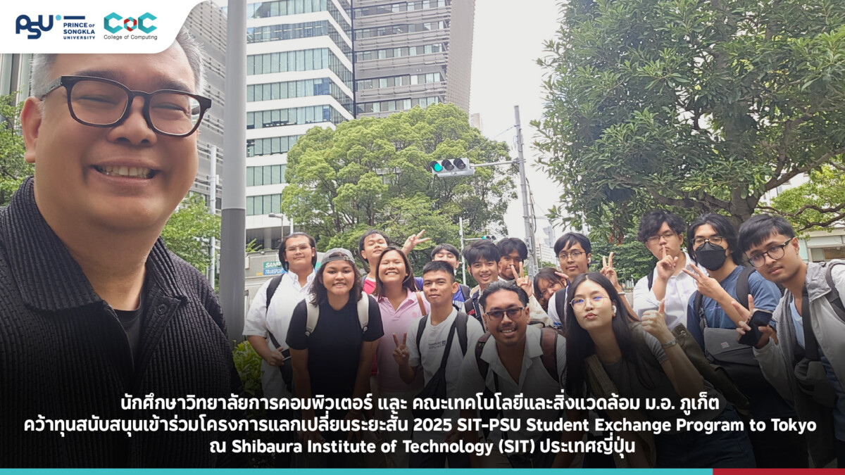 วันที่ 31 กรกฎาคม – 7 สิงหาคม 2568 นักศึกษา วิทยาลัยการคอมพิวเตอร์ และ คณะเทคโนโลยีและสิ่งแวดล้อม รวมจำนวน 15 คน ได้เข้าร่วมกิจกรรมในโครงการ “2025 SIT-PSU Student Exchange Program to Tokyo” ณ Shibaura Institute of Technology (SIT) ประเทศญี่ปุ่น ในหัวข้อ “Asia Design Global Workshop 2025 Summer at Tokyo” โดยได้รับทุนสนับสนุบทุนจาก Student Exchange Support Program: Scholarship for Short-term Study in Japan หรือ JASSO ซึ่งนักศึกษาที่ผ่านการคัดเลือกเข้าร่วมโครงการ ประกอบด้วย