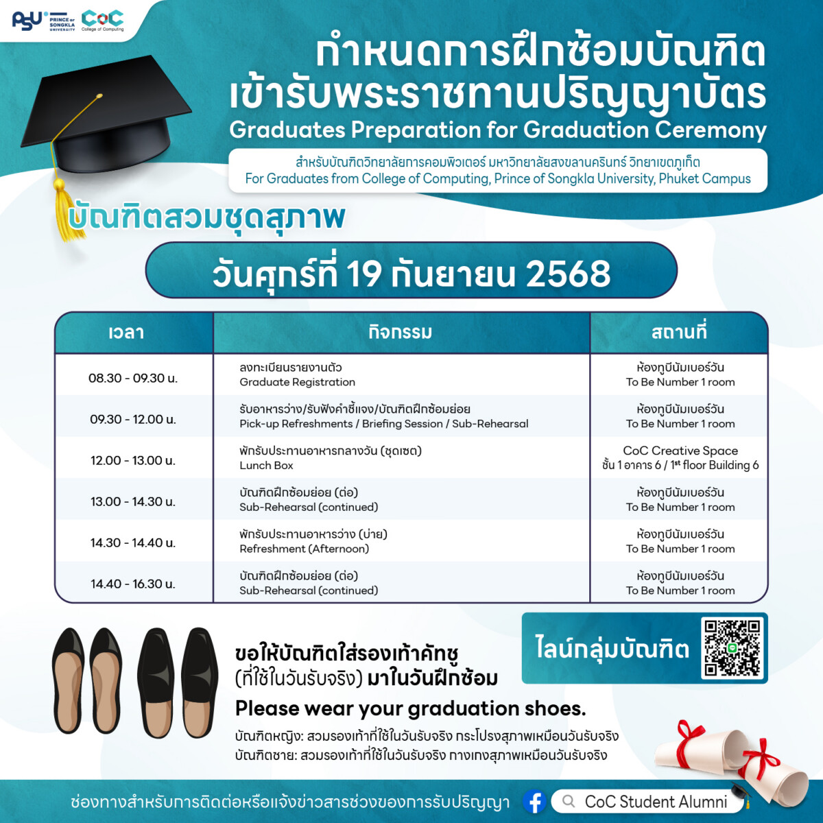 วิทยาลัยการคอมพิวเตอร์ มหาวิทยาลัยสงขลานครินทร์ ขอแสดงความยินดีกับบัณฑิตทุกท่านในวาระสำคัญของชีวิต 💙 สำหรับบัณฑิตวิทยาเขตภูเก็ต มีกำหนดการฝึกซ้อมเข้ารับพระราชทานปริญญาบัตร ประจำปีการศึกษา 2567 จะจัดขึ้นในวันที่ 19 – 20 กันยายน 2568