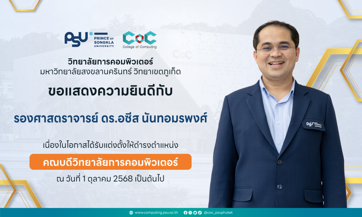 วิทยาลัยการคอมพิวเตอร์ มหาวิทยาลัยสงขลานครินทร์ ขอแสดงความยินดีกับ รองศาสตราจารย์ ดร.อซีส นันทอมรพงศ์ เนื่องในโอกาสได้รับการแต่งตั้งให้ดำรงตำแหน่ง คณบดีวิทยาลัยการคอมพิวเตอร์ ณ วันที่ 1 ตุลาคม 2568 เป็นต้นไป