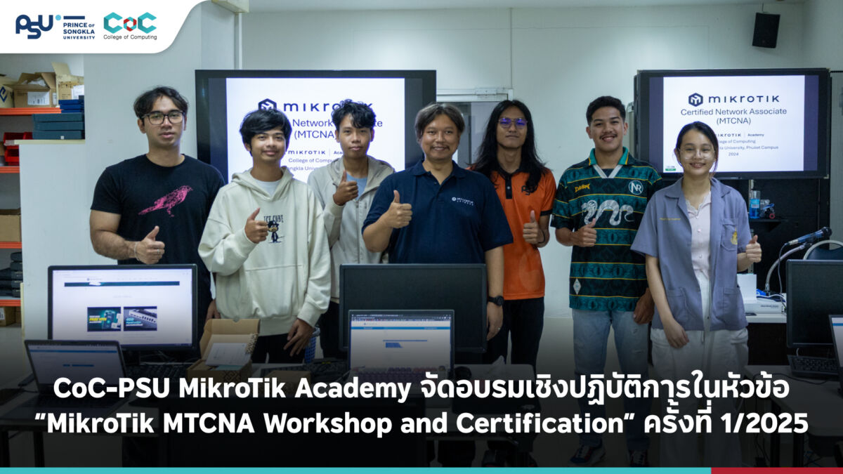 วิทยาลัยการคอมพิวเตอร์ มหาวิทยาลัยสงขลานครินทร์ วิทยาเขตภูเก็ต โดยศูนย์ CoC-PSU MikroTik Academy จัดอบรมเชิงปฏิบัติการ “MikroTik MTCNA Workshop and Certification ครั้งที่ 1/2025 (บรรยายไทย)” ระหว่างวันที่ 11–12 ตุลาคม 2568 ณ ห้องปฏิบัติการคอมพิวเตอร์ Network Lab 6601 ชั้น 6 อาคาร 6 เพื่อเสริมสร้างทักษะและความเข้าใจด้านระบบเครือข่ายคอมพิวเตอร์แก่นักศึกษา โดยมี ผศ.กุลวรรธน์ เชาวนวาที หัวหน้าศูนย์ CoC-PSU MikroTik Academy เป็นวิทยากรให้การบรรยายและสอนปฏิบัติในหัวข้อหลักสูตรมาตรฐานระดับสากลของ MikroTik Certified Network Associate (MTCNA) ซึ่งครอบคลุมการติดตั้ง การตั้งค่า และการจัดการอุปกรณ์เครือข่าย MikroTik เพื่อเตรียมความพร้อมให้นักศึกษาสามารถนำความรู้ไปประยุกต์ใช้ในสายงานวิศวกรรมเครือข่ายและเทคโนโลยีสารสนเทศได้อย่างมีประสิทธิภาพ