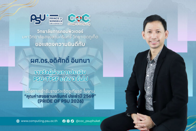 วิทยาลัยการคอมพิวเตอร์ มหาวิทยาลัยสงขลานครินทร์ วิทยาเขตภูเก็ต ขอแสดงความยินดีกับบุคลากรทุกท่านที่ได้รับรางวัลในงาน \”คุณค่าสงขลานครินทร์ ประจำปี 2568 (Pride of PSU 2025)\” ณ วันที่ 13 มีนาคม 2568 COC NEWS, Hall of Fame Staff
