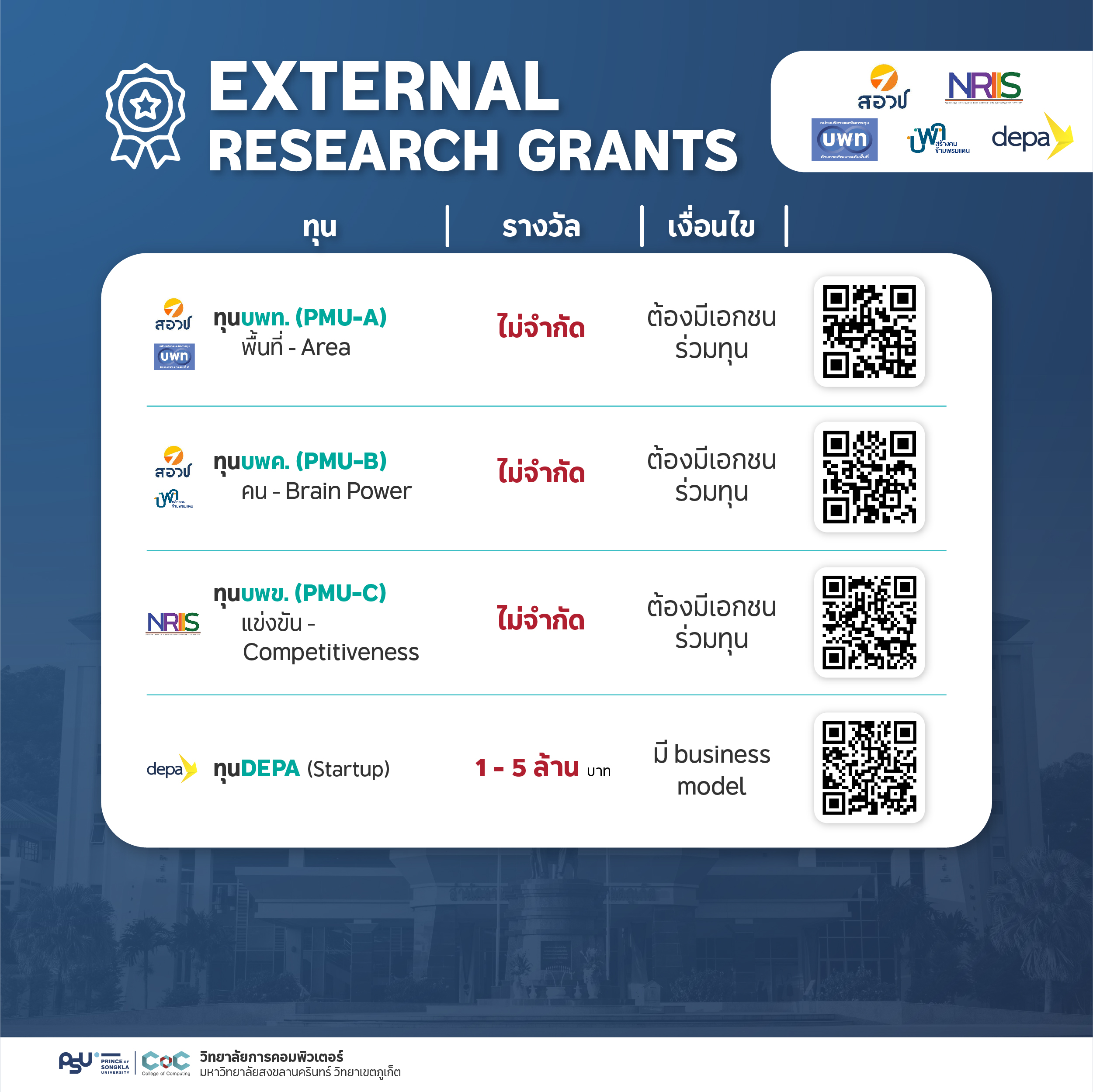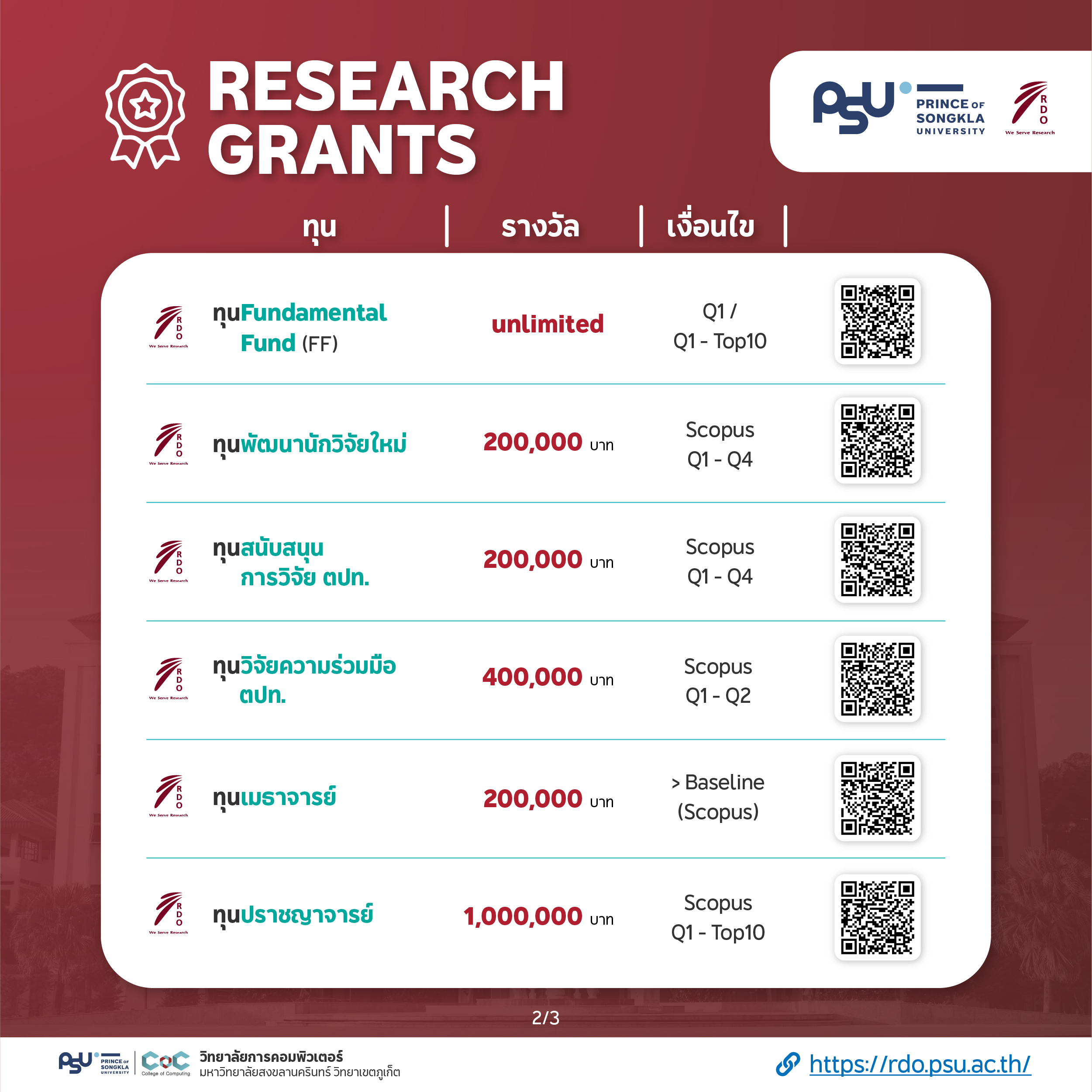 Research grants and rewards MenuPUBLICATION REWARDSRESEARCH GRANTSทุน CoCทุน RDOทุน PKTEXTERNAL RESEARCH GRANTS PUBLICATION REWARDS RESEARCH GRANTS – (ทุน CoC) – (ทุน RDO) – (ทุน PKT) EXTERNAL RESEARCH GRANTS